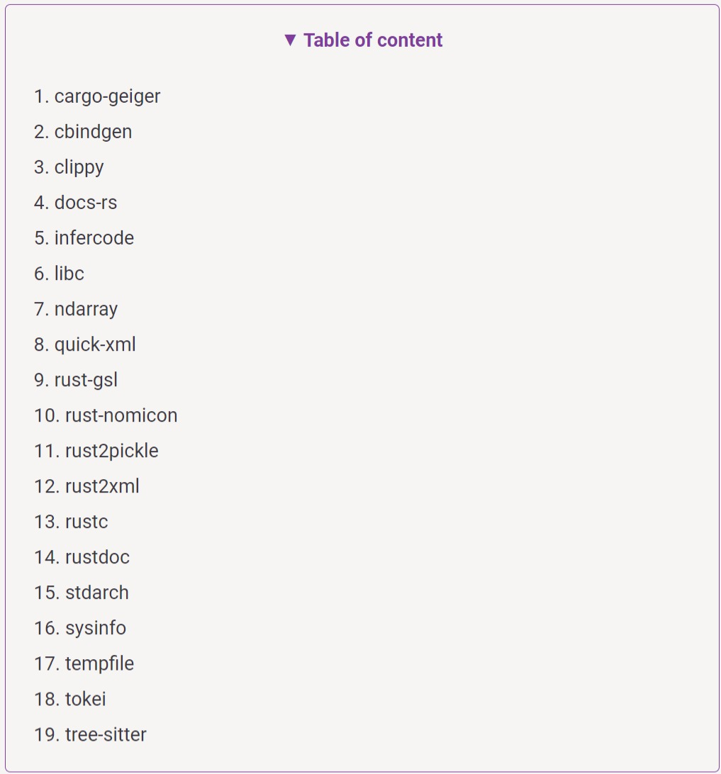 首先是针对已有软件项目的跨语言代码转换迁移,华为自研了一套 TXL 代码转换工具,实现了从 C 项目到 Rust 项目迁移的能力,并基于模式提升了 C 代码的安全代码比例;其次是通过深度代码学习,让机器替人学习一些简单的任务,比如华为自研的深度代码学习 Corder 工具已经能够实现 unsafe Rust 代码自动分类,准确率能够达到 93% 以上;还有 Rust 文档方面的优化工作,比如通过生成可互联的变量类型文档,使得 rustdoc 更容易导航。Guillaume Gomez 当前在 Rust 社区重点负责的就是 rustdoc 优化工作,从而让 Rust 文档更快、更轻量、更具交互性。他既是 rustdoc 团队负责人,也是 Rust 官方 dev-tools(开发工具团队)成员。