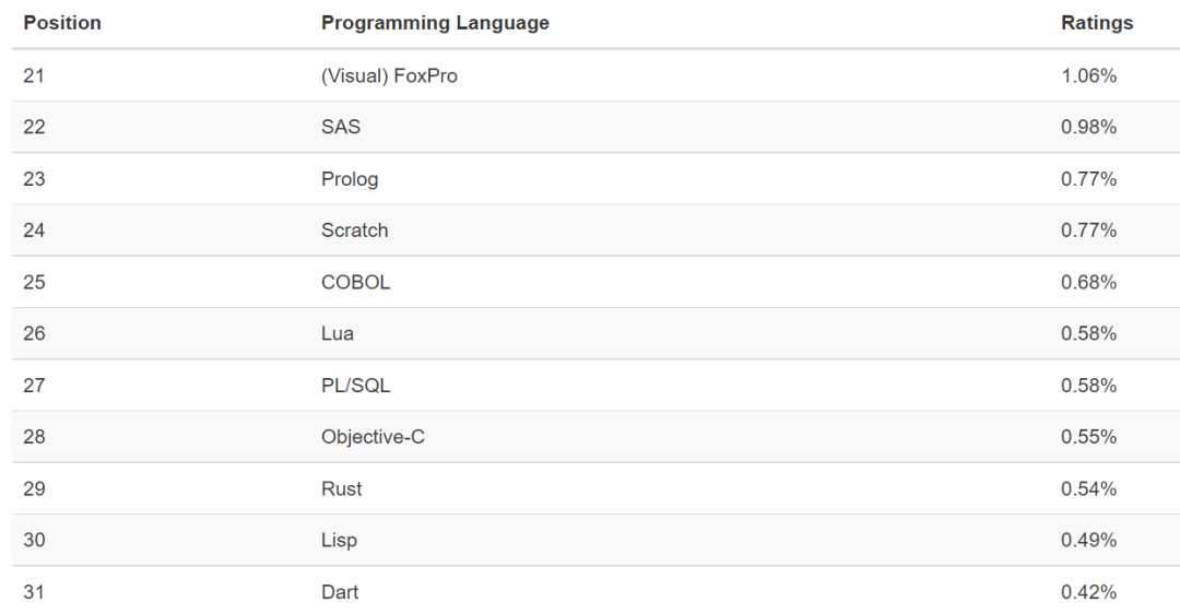 根据 11 月份最新发布的 TIOBE 编程语言排行榜数据,Rust 的占比仅为 0.54%,排名第 29 位。虽然相比今年年初,这个占比数据和排名已经略有提升,但距离排在第 18 位的 Go 语言(相比去年 11 月下降五位,占比 1.21%),还有不小的差距。
