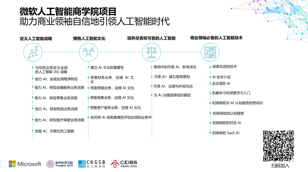 微软于2019年8月与清华大学经济管理学院、长江商学院和中欧国际工商学院联合启动全球首个线下互动教学与线上课程相结合的“微软人工智能商学院”项目(Microsoft AI Business School)。课程内容涵盖了定义人工智能战略、拥抱人工智能文化、培养尽责与可靠的人工智能、以及商业领袖必备的人工智能技术四大模块,旨在帮助企业领导者充分发掘人工智能最大潜力,推动全球各地、各行业现代企业实现数字化转型。