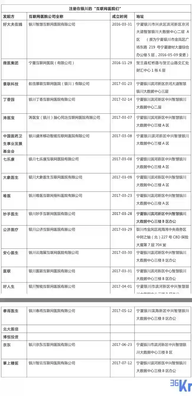 (36氪根据工商信息统计的注册在银川的“互联网医院们”)