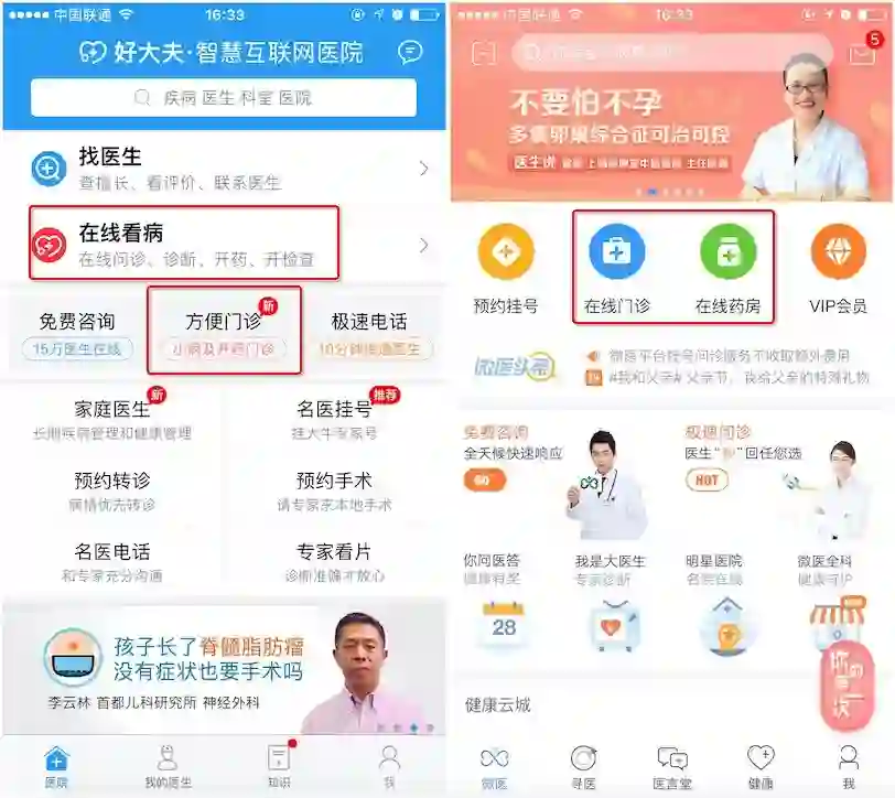 ( 好大夫在线APP中,有“在线看病”和“开药门诊”的功能。从微医APP中也可以看到,“在线门诊”、“在线药房”设置在页面居中醒目的位置)