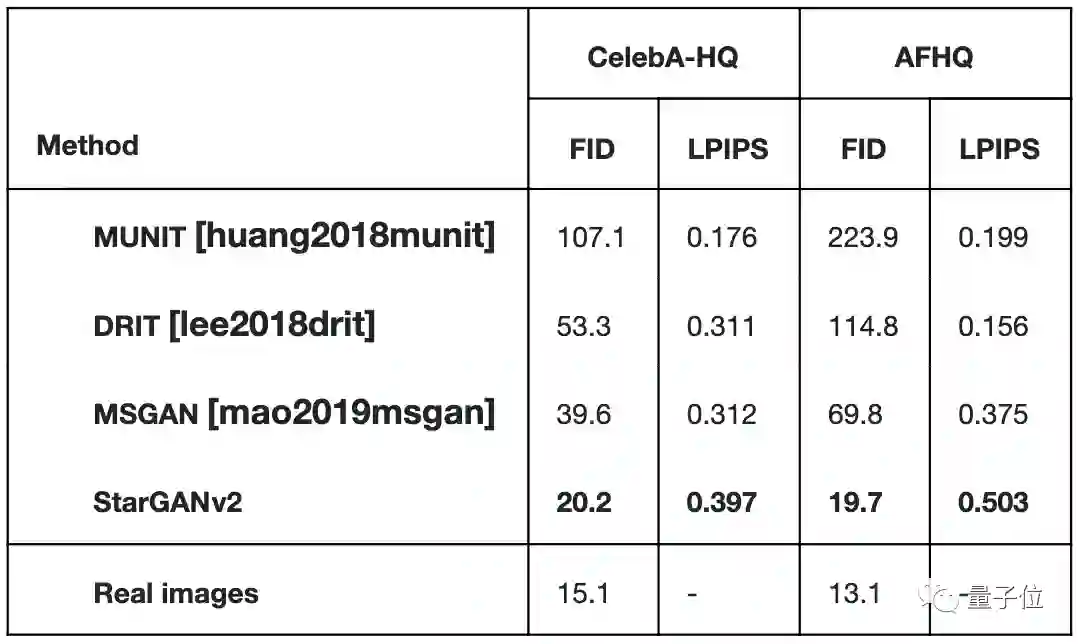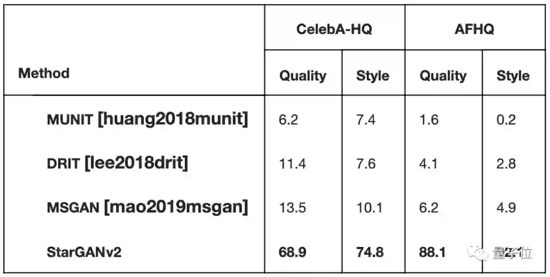 他们还把四种模型生成的图像上传到AMT平台,交给人工评选,绝大部分测试者都认为StarGANv2生成的图片更优质。