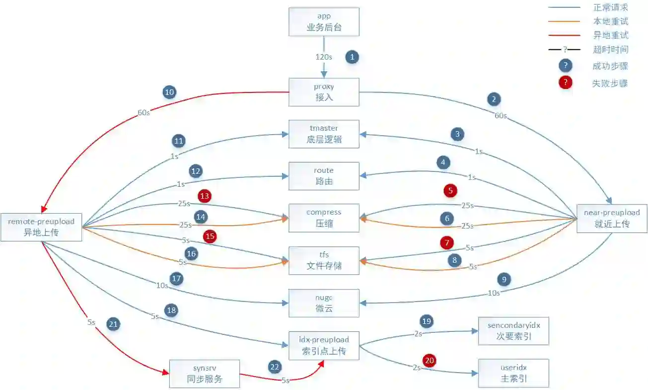 我们考虑了所有模块的过载保护功能,并极简重试机制:在设定的超时率范围内,仅在 proxy 层面做一次本地重试或异地重试!图 7 以一条最长的链路说明每个流程的超时时间设定。根据经验,业务对于上传的超时时间为 120 秒,proxy 本地请求一次超时为 60 秒,本地重试一次超时为 60 秒,异地请求一次超时为 60 秒。超时时间可能会在实际运营后进行调整优化。