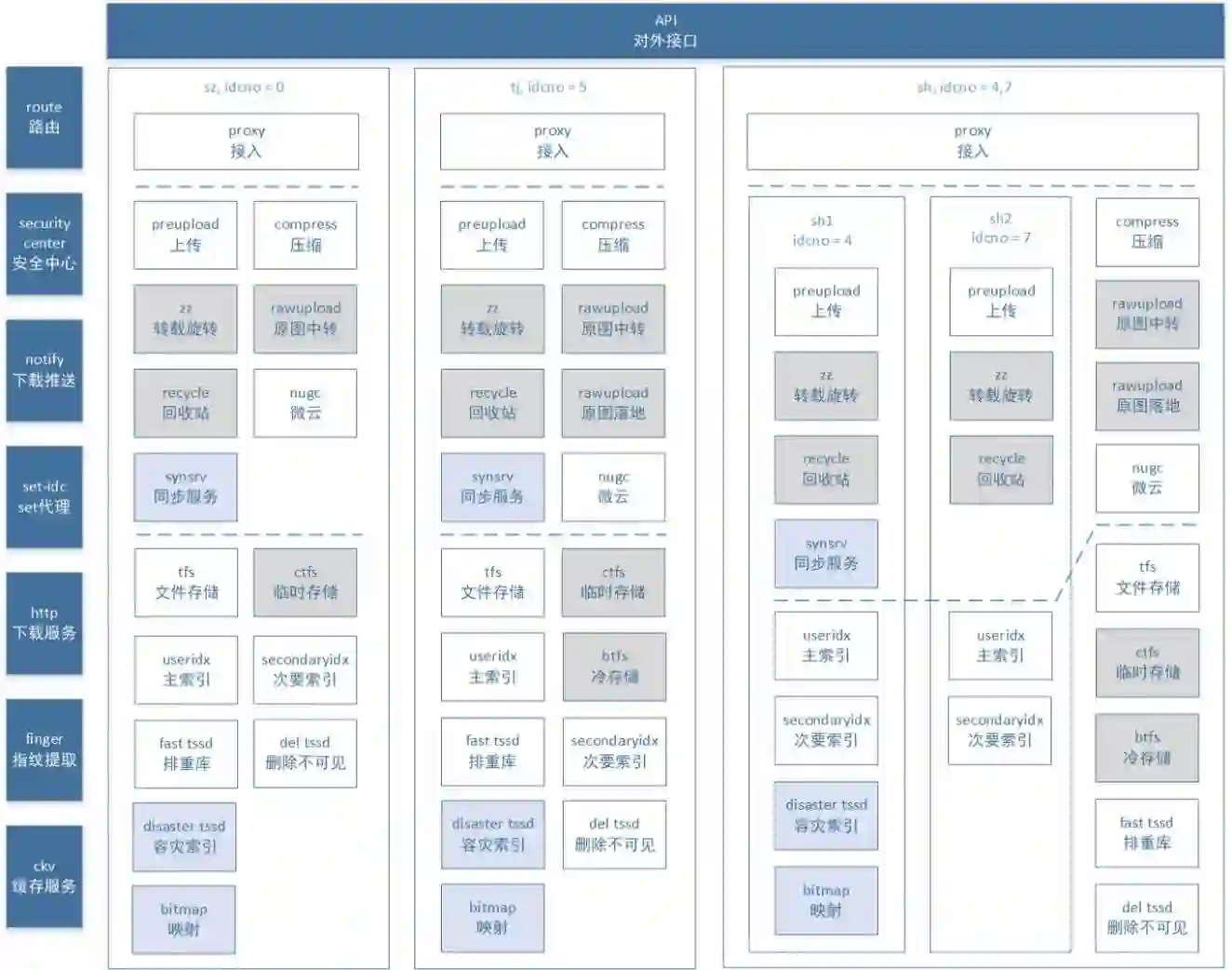 以往的架构调整,大都是用“拆”,但是,随着业务数据量的增长,以及业务需求变化的缓和,我们更加关注系统的稳定性和高可用性,于是此次重构,我们采用了“合”的思路,把 zz 和 rececyle 整合进 preupoad。看上去功能耦合了,preupload 变得更加臃肿,但是从 zz 和 recycle 的功能逻辑来看,和 preupload 是一样的或者很相似的,底层也是共用一套存储,将他们独立部署,时间久了,三个模块的代码逻辑差异越来越大,直接导致开发维护和运维的困难。新架构还把一些已经没用的模块去掉,比如 ckv 系统,原图系统等,然后将原图功能完全接入秒传率更高的微云系统,容灾模块也从原来三地部署、两两互备,变成单独园区部署。重构如图 3 所示。