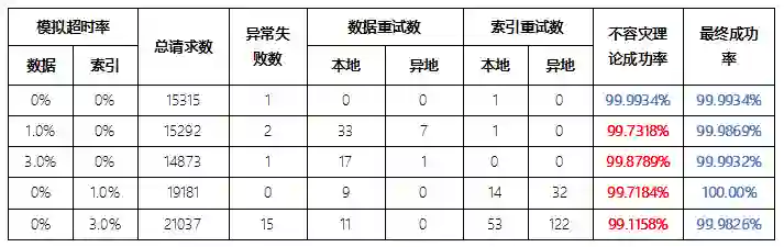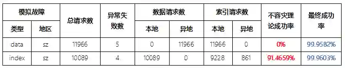 3、容灾能力提升。新的容灾策略基于精心整理的错误码分类,能做到精准的异地容灾,容灾功能上线以来,可以看到一些小波动的故障也能及时触发异地容灾,成功率得到更完备的保障。不过,上线以来还未出现过大型故障,因此我们也进行了现网故障演习,演习结果表明,新的容灾逻辑在应对大型故障也有不错的表现。表 3 和表 4 分别为容灾级别为 2 级和 3 级配置下的演习数据。