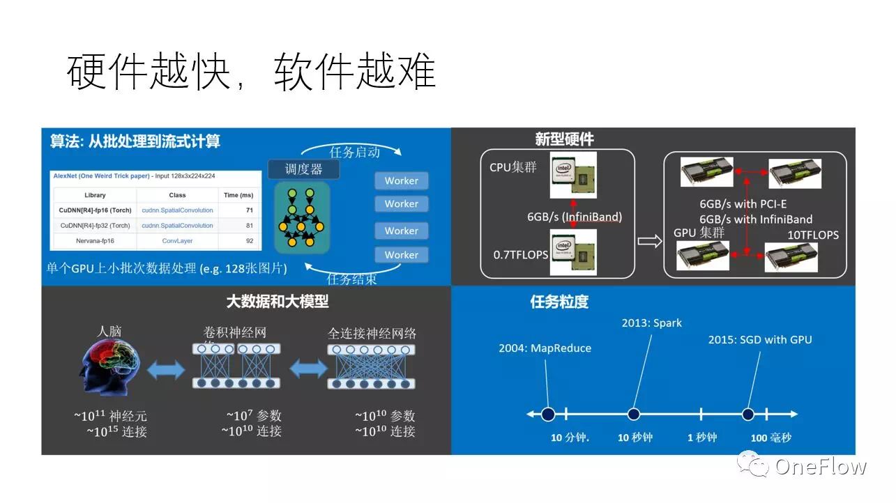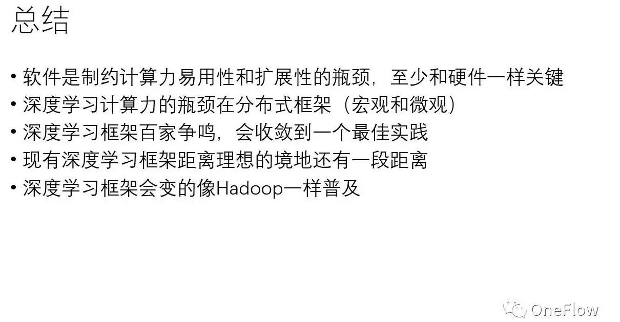 让我们重申一下几个观点:(1)软件真的非常关键;(2)我们对宏观层次(设备和设备之间)的优化更感兴趣;(3)深度学习框架存在一个理想的实现,正如柏拉图心中那个最圆的圆,当然现有的深度学习框架还相距甚远;(4)各行各业的公司,只要有数据驱动的业务,最终都需要一个自己的“大脑”,这种“大脑”不应该只被少数巨头公司独享。