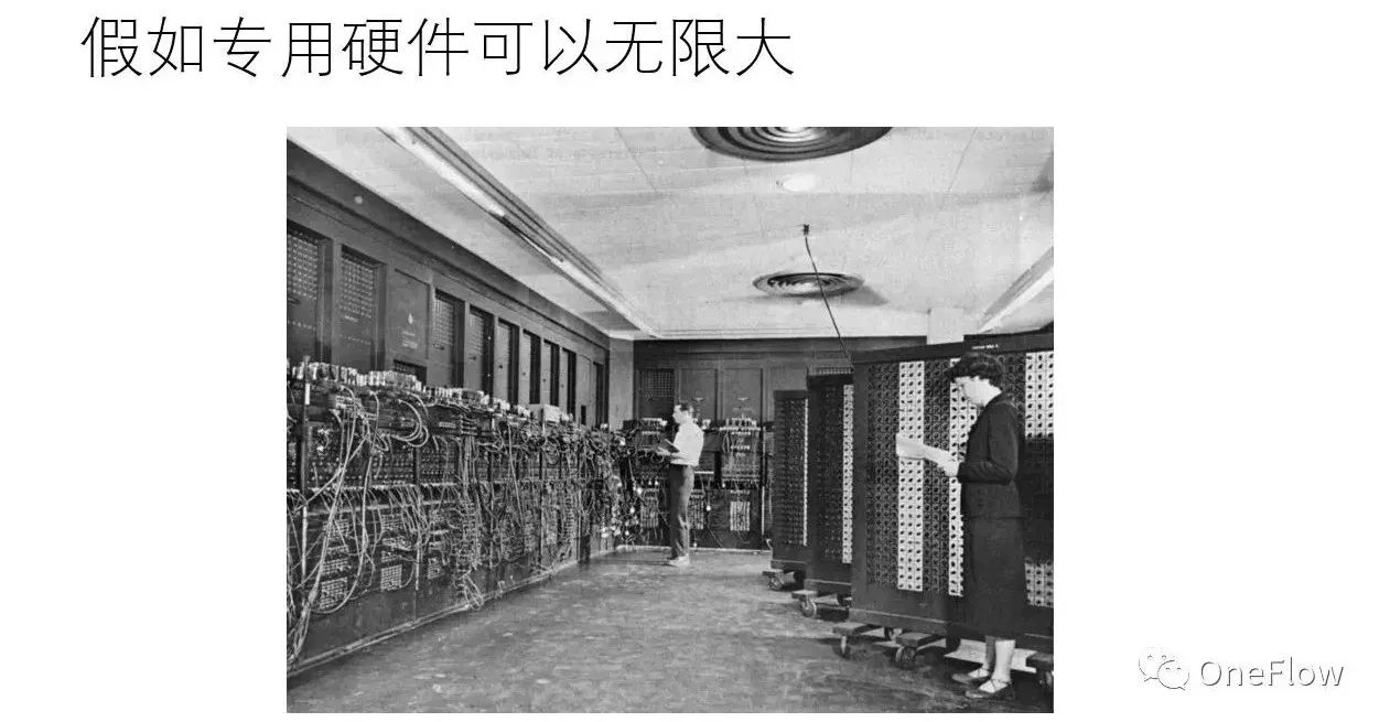如果对任何一个神经网络都实现一套专用硬件,运行效率最高,可是开发效率不高,需求一变更(神经网络拓扑结构,层数,神经元个数),就需要重新设计电路,而硬件研发周期臭名昭著的长。这让人联想起冯诺依曼发明“存储程序”计算机之前的电子计算机(下图即第一台电子计算机ENIAC 的照片),计算机的功能通过硬连线(hard-wired)电路实现,要改变计算机的功能就需要重新组织器件间的连线,这种“编程”方式又慢又难以调试。