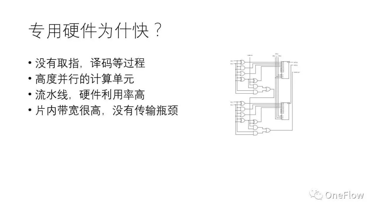 专用硬件比通用硬件(如CPU、GPU)快,有多种原因,主要包括:(1)通用芯片一般经历“取指-译码-执行”(甚至包括“取数据”)的步骤才能完成一次运算,专用硬件大大减小了“取指-译码”等开销,数据到达即执行;(2)专用硬件控制电路复杂度低,可以在相同的面积下集成更多对运算有用的器件,可以在一个时钟周期内完成通用硬件需要数千上万个时钟周期才能完成的操作;(3)专用硬件和通用硬件内都支持流水线并行,硬件利用率高;(4)专用硬件片内带宽高,大部分数据在片内传输。显然,如果不考虑物理现实,不管什么神经网络,不管问题的规模有多大,都实现一套专用硬件是效率最高的做法。问题是,这行得通吗?