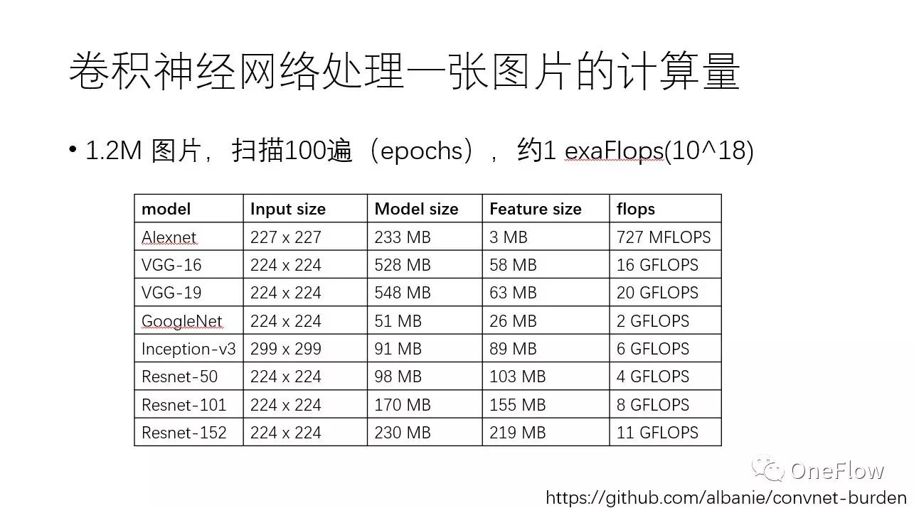 以大家耳熟能详的卷积神经网络CNN 为例,可以感觉一下目前训练深度学习模型需要多少计算力。下方这张表列出了常见CNN模型处理一张图片需要的内存容量和浮点计算次数,譬如VGG-16网络处理一张图片就需要16Gflops。值得注意的是,基于ImageNet数据集训练CNN,数据集一共大约120万张图片,训练算法需要对这个数据集扫描100遍(epoch),这意味着10^18次浮点计算,即1exaFlops。简单演算一下可发现,基于一个主频为2.0GHz的CPU core来训练这样的模型需要好几年的时间。