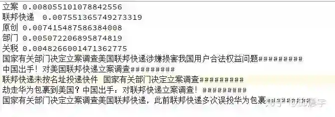 关于话题聚类,还有一个细节要说明一下。通过BTM学习后,我们能够得到文档-主题的概率分布,以及主题-词的概率分布。我们主要使用文档-主题的概率分布来做话题聚类,聚类完成后,我们通过整合聚类后每个聚簇中心的话题分布和主题-词概率分布,能够得到每个聚簇上的词的分布,这个概率分布大致可以表示一个词在该聚簇上的重要性。后续在做聚簇优化时,可以利用该关键词信息进行聚簇的合并或者分裂。下图为某个聚簇计算得到的关键词结果: