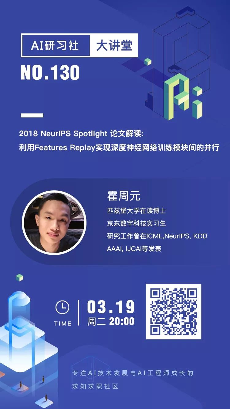 反向传播算法是深度学习优化中计算梯度的有效方法。然而随着网络层数逐渐增加,梯度在网络间的序列传播 (backward locking) 成为加速深度学习模型训练的重要瓶颈。本次分享中,讲者将介绍如何利用历史特征信息,实现深度网络模块间的并行计算。
