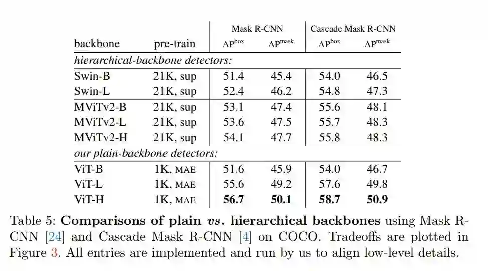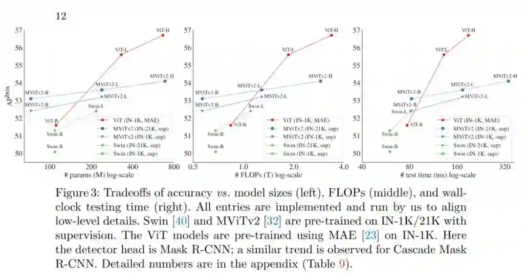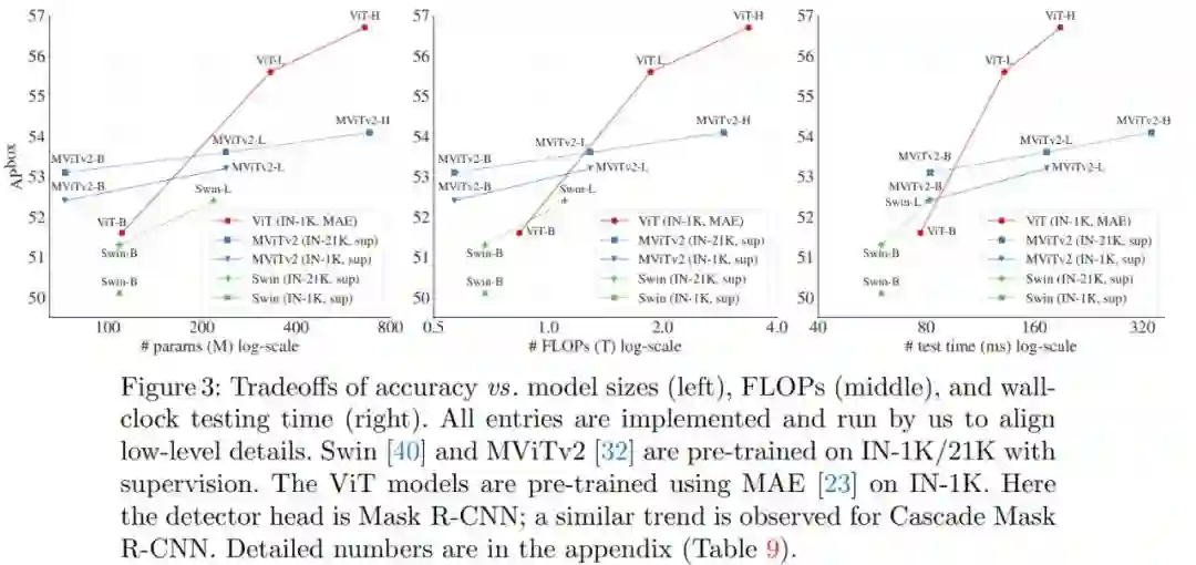 更令人惊讶的是,在某些情况下,研究者开发的名为「ViTDet」的普通主干检测器可以媲美领先的分层主干检测器(如 Swin、MViT)。通过掩蔽自编码器(MAE)预训练,他们的普通主干检测器可以优于在 ImageNet-1K/21K 上进行有监督预训练的分层检测器(如下图 3 所示)。
