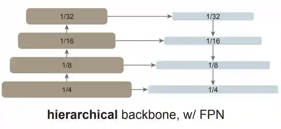 当前的目标检测器通常由一个与检测任务无关的主干特征提取器和一组包含检测专用先验知识的颈部和头部组成。颈部 / 头部中的常见组件可能包括感兴趣区域(RoI)操作、区域候选网络(RPN)或锚、特征金字塔网络(FPN)等。如果用于特定任务的颈部 / 头部的设计与主干的设计解耦,它们可以并行发展。从经验上看,目标检测研究受益于对通用主干和检测专用模块的大量独立探索。长期以来,由于卷积网络的实际设计,这些主干一直是多尺度、分层的架构,这严重影响了用于多尺度(如 FPN)目标检测的颈 / 头的设计。