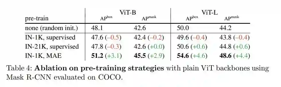 3、掩蔽自编码器可以提供强大的预训练主干。表 4 比较了主干预训练的策略。