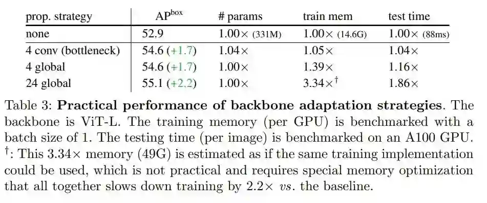 2、在几个传播块的帮助下,窗口注意力就足够了。表 2 总结了本文提出的主干调整方法。简而言之,与只有窗口注意力、无跨窗口传播块的基线(图中的「none」)相比,各种传播方式都可以带来可观的收益。