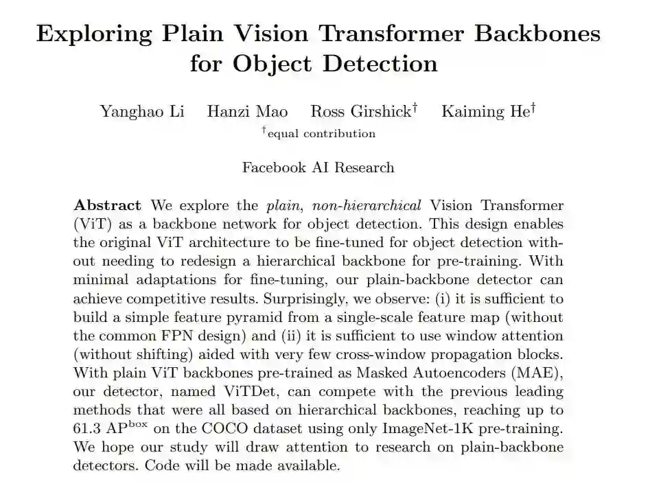 做目标检测就一定需要 FPN 吗?昨天,来自 Facebook AI Research 的 Yanghao Li、何恺明等研究者在 arXiv 上上传了一篇新论文,证明了将普通的、非分层的视觉 Transformer 作为主干网络进行目标检测的可行性。他们希望这项研究能够引起大家对普通主干检测器的关注。 >>加入极市CV技术交流群,走在计算机视觉的最前沿