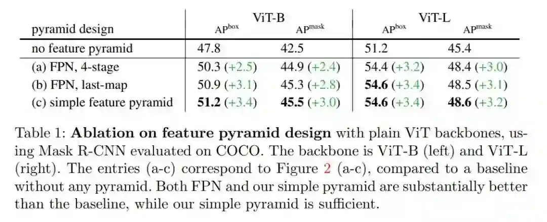 1、一个简单的特征金字塔就足够了。在表 1 中,他们比较了图 2 所示的特征金字塔构建策略。