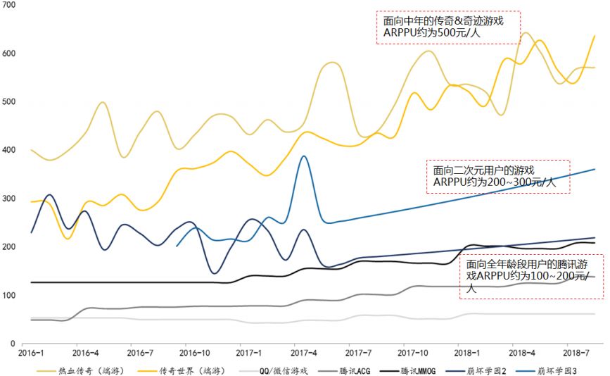 一般地,30岁以上的游戏玩家,工作经验达5年以上,有一定经济基础,因而有更高的氪金能力。从各游戏2018年月度ARPPU(每付费用户平均收益)指标来看,由中年玩家支撑起的传奇/奇迹类游戏月ARPPU约为600元/人;面向二次元玩家的游戏月 ARPPU约为200~300元/人;用户面更广泛的腾讯类游戏月ARPPU约为100~200元/人,如下图所示。