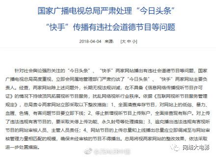 4月4日,国家广播电视总局发布通知,要严肃处理今日头条、快手传播有违社会道德节目等问题。并称“今日头条”和“快手”两家网站播出有违社会道德节目等问题,在不具备《信息网络传播视听节目许可证》的情况下持续顶风拓展视听节目服务,扰乱网络视听行业秩序。