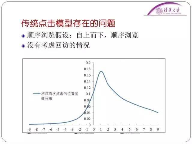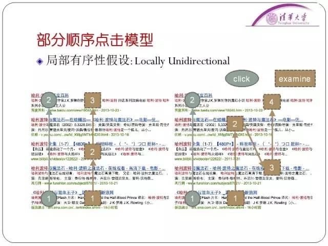 它的分析方法就是用户会不会继续向下检验是和当前文档的位置有关,也和前次被点击文档的距离有关。虽然这个模型效果已经不错了,但是里面仍然存在着问题。比如说这个模型是建立在“顺序浏览”假设上的。“顺序浏览”假设是指用户从上到下按顺序浏览,不考虑有“回访”的情况。