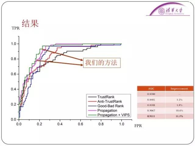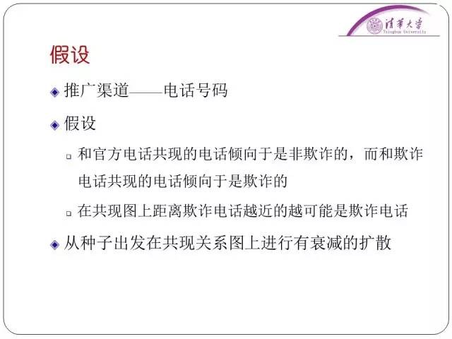 为此我们标记了一些真正的客服电话作为“正面”种子,定义了一些欺骗客服电话作为“负面”种子,我们定义了电话的共现关系图。比如说和官方客服共现的一般是可信赖的电话,和欺诈电话共现的号码一般是欺诈电话。通过在电话的共现关系图中迭代传播“正面”电话和“负面”电话,最终识别出欺诈客服电话,取得了很好的结果。