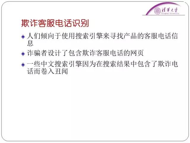 比如说冰箱坏了,从搜索引擎上搜了一个厂家的客服电话,但是打开的网页是个欺诈网页,打的电话也是个诈骗电话。最后假的厂家客服上门了之后,才发现自己被诈骗了。