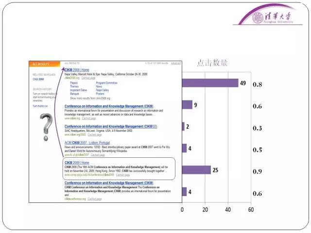 用户有可能就点击前几个,然后随手滚轮一滚动就点击到第九、十个去了,我们要做的工作就是把这个影响消除掉。我们找一个简单的例子来示意,比如这个CKIM会议的搜索结果,比如今年是2009年,今年的CKIM会议网站新出来,如果直接按点击量排序,在搜索引擎上搜索,2008年的会议肯定会被排序到前面。