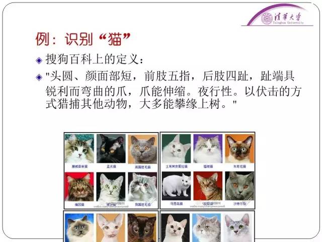 我们结合具体的例子来看,比如我们做识别猫的应用,那么什么是猫?我们查了一下搜狗百科:”头圆、颜面部短,前肢五指,后肢四趾,趾端具锐利而弯曲的爪,爪能伸缩。夜行性。以伏击的方式猎捕其他动物,大多能攀缘上树。”,这个东西我们人能看懂,但是,我们自己识别猫的时候肯定不会按照这个去做。可能我们看到一个稀有的品种,或者是研究猫的专家会去研究这个定义。但是我们让计算机去做,这是不行的,按照这个定义来,肯定识别不出猫。那我们现在怎么定义?给些图片就行了,这就是现在大家做的。我给一大堆图片,告诉系统类似于这个的都是猫,类似于这些的肯定不是猫。这就是我们下的一个定义。加上机器学习算法,可能就能识别猫了。