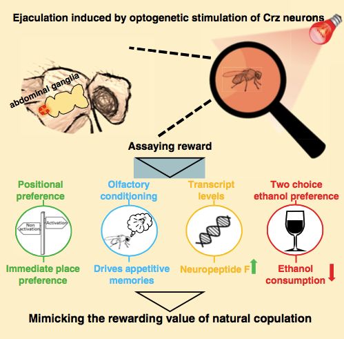 雄性果蝇视交配为一种自然奖励,成功射精的雄性果蝇脑内有较高水平的神经肽F,显然,由Crz信号通路诱导的射精过程正是这一自然奖励最重要的一部分,这也是人类首次看到大脑以外的神经元可以诱导奖励行为。