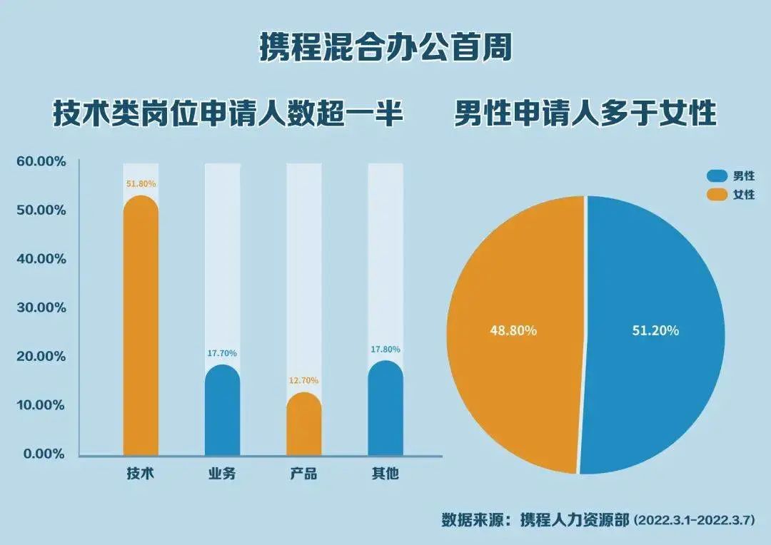 8日,携程公布了“混合办公”开放申请一周的数据情况:男性员工申请比例高于女员工(48.8%);90后申请占比近65%,是80后申请者的2倍;75%的申请者选择周五远程办公;近30%带娃家长在首周提交了混合办公申请。职能上看,首周申请排名前三的岗位及占比分别是技术类51.8%,业务类17.7%,产品类12.7%。
