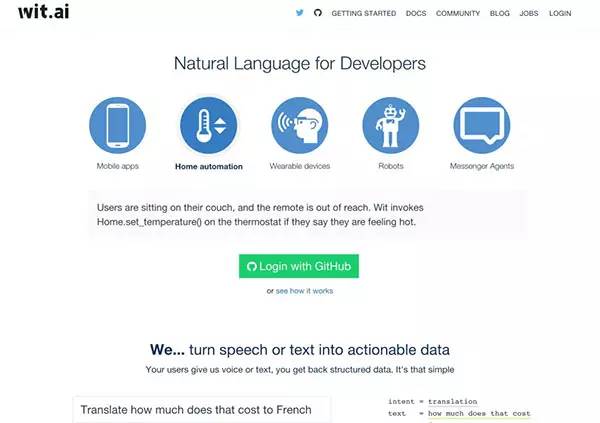 Wit.ai 为iOS,Android,Node.js,Raspberry Pi,Ruby,Python,C,Rust 和 Windows Phone 的开发人员提供一个 Wit.ai API。它甚至为前端开发人员提供一个JavaScript插件。