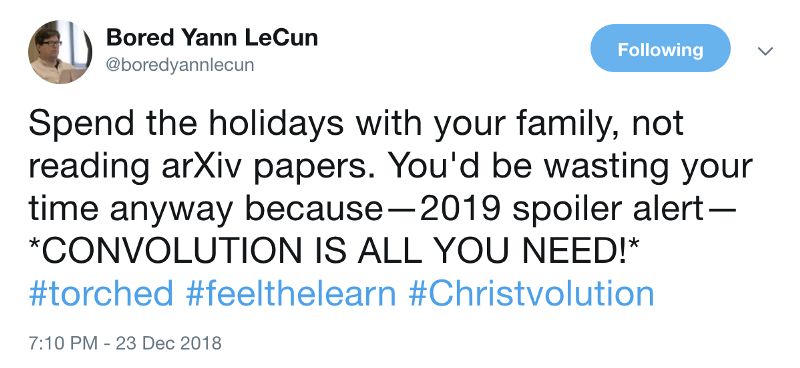 至于人工智能方面的更多基础性突破,可能是我和我的关注点,但我并没有看到太多。我不完全同意辛顿的观点,他说缺乏创新是因为这个领域有“一些资深人士和无数的年轻人”,尽管在科学领域确实存在一种趋势,即突破性研究是在较晚的年龄完成的。在我看来,目前缺乏突破的主要原因是现有方法和变化仍然有许多有趣的实际应用,所以很难冒险采用那些可能不太实际的方法。当该领域的大部分研究由大公司赞助时,这一点就更加重要了。无论如何,一篇对某些假设提出挑战的有趣论文是“对用于序列建模的通用卷积网络和循环网络的实证评估”。虽然它是高度经验主义并使用已知的方法,但它打开了发现新方法的大门,因为它证明了通常被认为是最佳的方法实际上不是最佳的。需要明确的是,我不同Bored Yann LeCun所认为的看法,即卷积网络是最终的“主宰算法”,而是认为RNN也不是。即使是序列建模也有很大的研究空间。另一篇具有高度探索性的论文是最近的NeurIPS最佳论文奖“神经常微分方程”,它挑战了深度学习中的一些基本内容,包括层本身的概念。