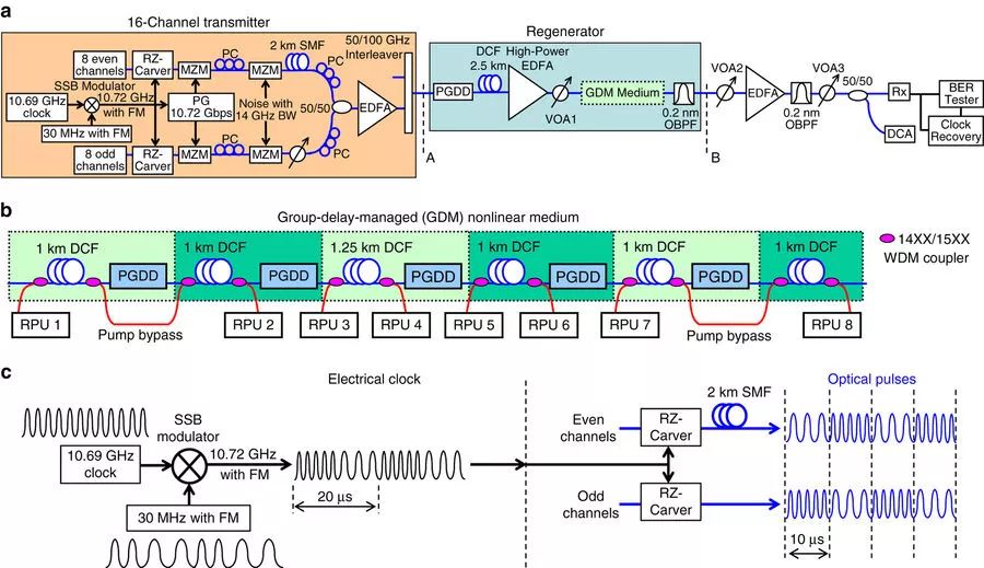 在他们发表的论文中,Vasilyev 及其同事们通过实验演示,报告了一种新型“群延迟管理的非线性光学介质”。在这种介质中,实现强烈的SPM效应不会带来信道间的干扰。将传统的非线性媒介,例如光纤,拆分为几个短部件。这些部件由特殊的周期性群延时过滤器分开,这些过滤器产生一种介质,在这种介质中,同样的WDM信道的所有频率部件的光线传输速度相同,从而保证了强烈的SPM。不同的WDM信道中,光线以不同的速度传播,这样明显地抑制了信道间的交互。