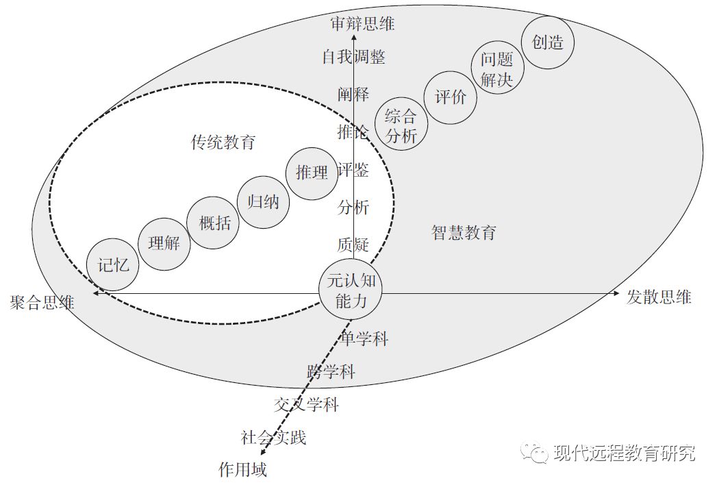 (4)智慧教育中学生的思维是将聚合思维与发散思维进行有效整合的综合思维。较之传统教学关注以分析能力为基础的聚合思维,智慧教育更重视促进学生创造能力发展的发散思维。从关系上看,智慧教育是对传统教育的反思拓展和延伸思考,两者(智慧教育与传统教育)并无严格划清的界限。