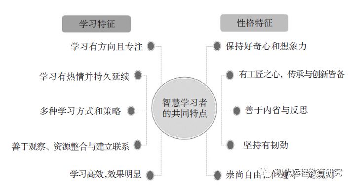从性格特征来看,好奇心和想象力带来的是对问题的质疑与探究,学习的主动和积极;工匠之心意味着专注、精益求精的态度,既吸收传统的精华又善于创造新的成果;内省与反思则是随时思考自己的言语、行为表现等是否符合道德或者创造的规律,通过元认知审视活动,随时不断完善想法和改善行动;坚持的态度对要做成任何事情都是需要的;对智慧学习者来说,有独立的思想和遵守一定的规则不是矛盾的,规则是自由的前提。