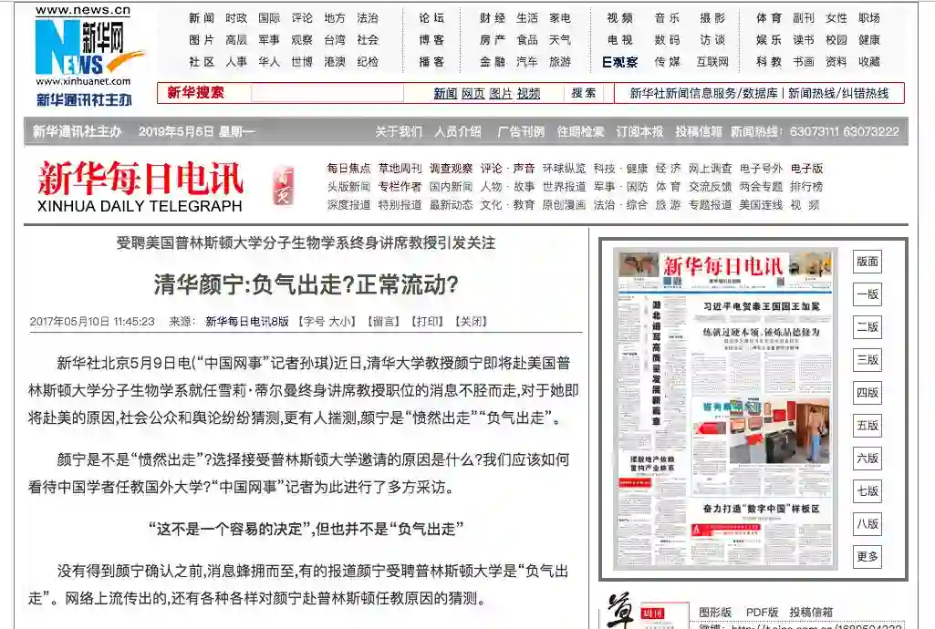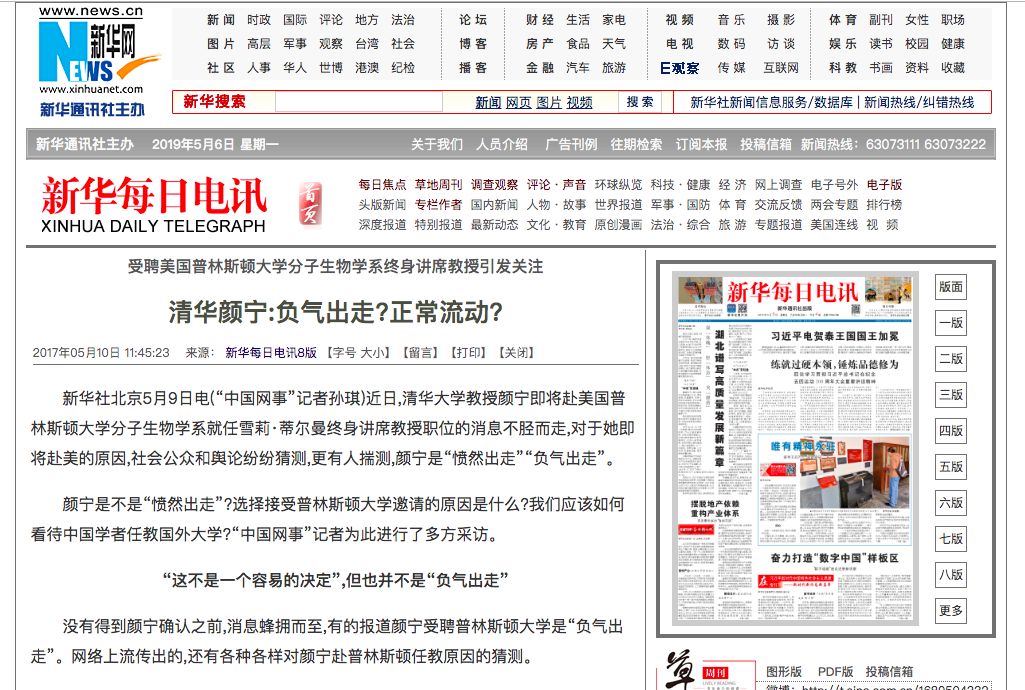 据新华社报道,此前,颜宁赴美国普林斯顿大学分子生物学系就任雪莉·蒂尔曼终身讲席教授职位时,有的消息称,颜宁受聘普林斯顿大学是“负气出走”。