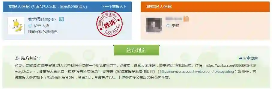 截至记者发稿时,不实网帖已被发帖人删除,发帖人账号也已被微博官方处以“扣除信用积分5分,禁言7天,禁被关注7天”的处罚。
