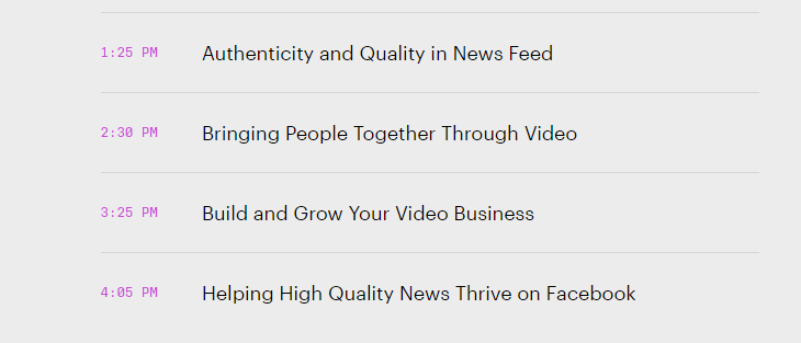 今年有四个主题演讲以「视频和新闻」为主题,其中谈到的内容包含视频和新闻在 Facebook 产品中扮演的角色,以及视频和新闻在未来的商业化路径。