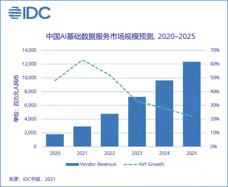 IDC 预测,到 2025 年,中国人工智能数据采标服务市场规模将达到 123.4 亿元人民币。市场的发展驱动力一方面来源于人工智能市场的迅猛发展,另一方面来源于行业用户加大数据采集力度。