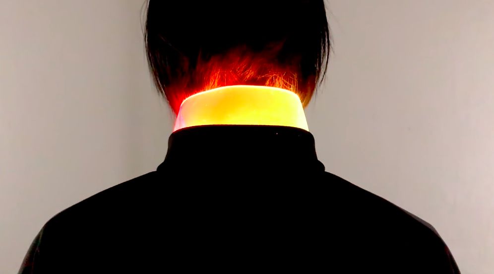 一件黑色的夹克衫,领子是一条加了 LED 彩灯的塑料光带,衣服的下摆中藏着一颗声音传感器。根据人们身边声音的大小,LED 彩带幻化成不同颜色,让人不得不注意拉风的衣领。不说别的,绝对是小姐姐小哥哥们的理想夜店战袍。
