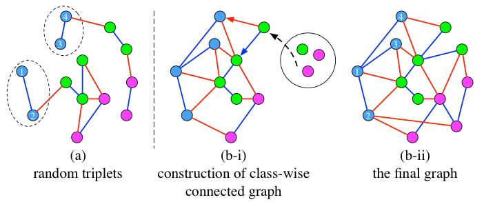 图三:此图展示了不同的构建三元组的方式。节点的颜色代表其类别。蓝色和红色的边分别代表「相吸边」和「相斥边」。(a)是随机选择的三元组(Schroff, Kalenichenko, and Philbin 2015),其中来自相同类的节点不能构成一个连通图。(b-i)和(b-ii)是我们通过构建无向图来构建三元组的方法。我们构建的无向图中,每一类都分别构成一个连通子图。