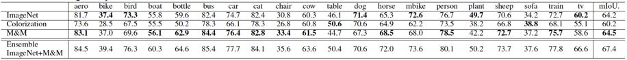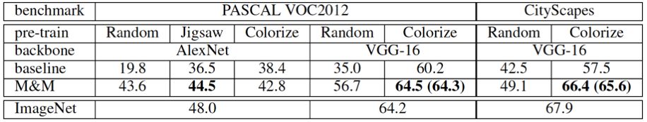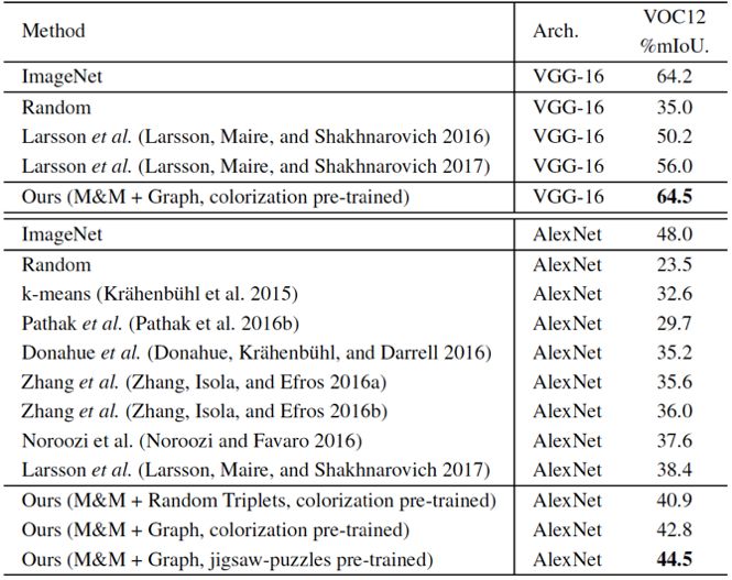表一:在此数据集是公认的语义分割数据集,PASCAL VOC2012 数据集上的结果对比。我们的方法同时在 VGG-16 和 AlexNet 上大幅度超过了目前最好的基于自监督初始化的方法,并且在 VGG-16 上超过了 ImageNet 初始化的方法。