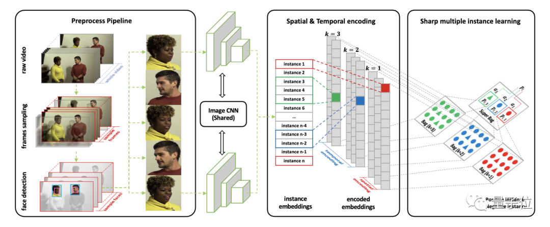 首先,对输入视频中的采样帧进行人脸检测,并将提取的人脸喂给CNN,以获取特征作为实例。