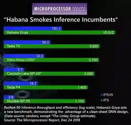 Habana可以说在18年的AI Hardware Summit上是一鸣惊人,直接从stealth状态到拿出芯片产品,一改AI芯片“先发布后...”的“传统”。它们的Inference芯片Goya,Benchmark结果也非常漂亮。另外,它们的Benchmark结果是Resnet-50,每秒出来的图片数量,IPS(Image Per Second)来评价的。相对于TOPS来说,这种方式可以更合理的评价Inference的实际Throughout,而不是单纯的峰值计算能力。相信这种Benchmark的方式也回被越来越多的采用。