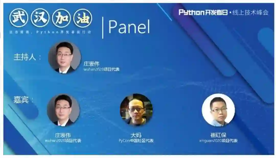 在峰会的圆桌论坛里,开源社理事、执行长,华为内源平台架构师,wuhan2020 开源项目的密切参与人庄表伟,DCloud CTO、Uni-App 团队负责人、xinguan2020 项目代表崔红保,Python 中国社区联合创始人、蟒营课程架构师、社区人称“大妈”的 Zoom.Quiet,一起思考在疫情下,开源项目以及社区做了什么,还能做什么?为本次大会画上一个开放性结尾,也引发之后系列线上主题大会。
