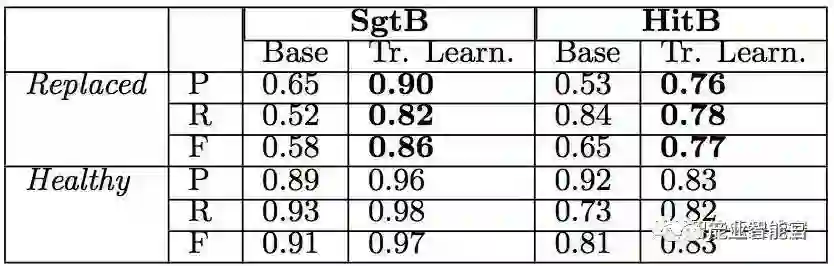 作者分别使用两个厂商生产的磁盘的数据集SgtA和HitA训练模型,并使用迁移学习的方法将两种模型分别应用于同厂商的其他磁盘数据集SgtB和HitB上。上表分别展示了直接将模型 A应用于磁盘B上以及运用迁移学习方法将模型A应用于磁盘B的替换预测的准确率、召回率、F-分数。可以看出,应用迁移学习方法后,预测准确性得到了很大提高,从而大大减少了需要训练的模型数量。