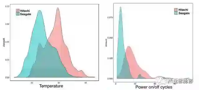 不同类型的磁盘SMART存在差异。SMART是特定于制造商的,它们的编码和标准化在制造商之间差别很大,所以不能使用同一个预测性模型来判断不同型号的磁盘。下面两个图展示的是不同类型磁盘的SMART数据差异,其中左图表示的是温度,右图表示的是开机关机的周期,从两个图的对比可以看出,不同类型的磁盘SMART确实存在差异。