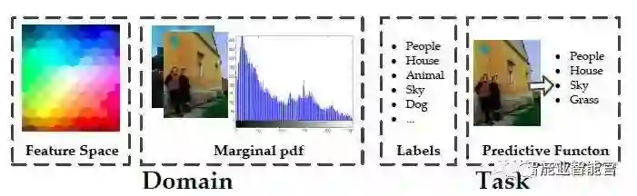 任务(task):给定一个域,任务还包含两个要素,标签空间(label space)y和预测函数(predictive function)f(·)=P(y|x)。例如,一组图片中可能出现的所有元素构成一个标签空间,而通过预测函数可以得出某幅特定图片中包含哪些元素。