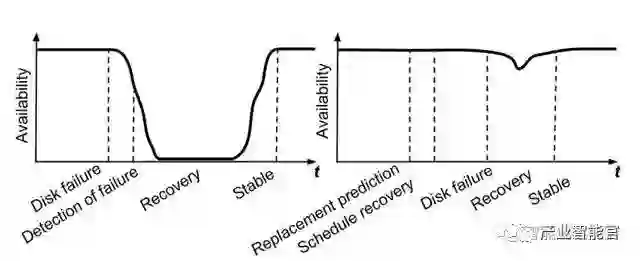 左图代表的是传统的磁盘异常检测,磁盘状态开始变差后才检测到磁盘故障,这时的可用性已经降到了最低才开始更换磁盘。