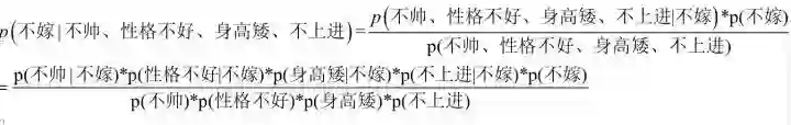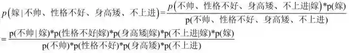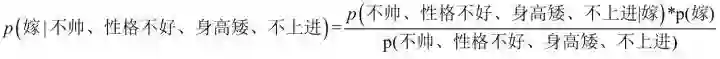 下面我们根据同样的方法来求p(不嫁|不帅,性格不好,身高矮,不上进),完全一样的做法,为了方便理解,我这里也走一遍帮助理解。首先公式如下: